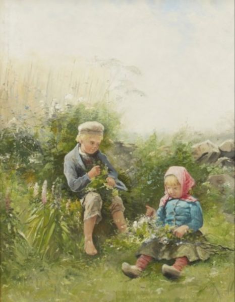Barn plockandes blommor.