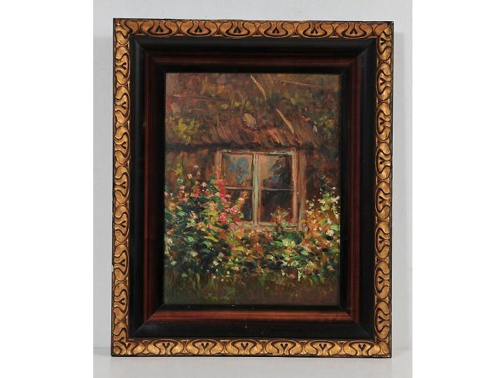 Motiv av fönster samt trädgårdsblommor