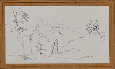 A rural landscape with a peasant woman. Verso rural landscape. And three other drawings by the same artist. All unsigned. Drawing ink on paper. Sheet sizes 47×78 mm and 116×135 mm. (4). | |