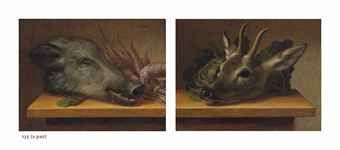 | Head of a boar with a bundle of parsnips on a ledge; and Head of a deer with cabbage on a ledge | |