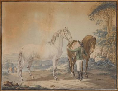 Pferdeführer mit Schimmel und Junghengst.
