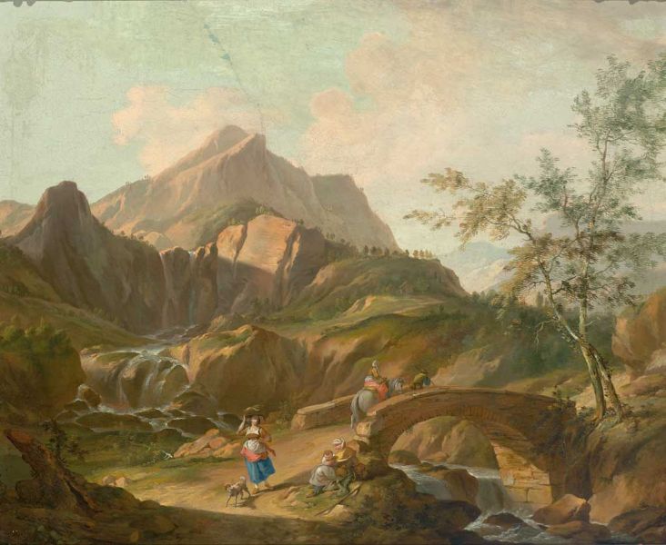 Landschaft mit Landbevölkerung an einer steinernen Brücke