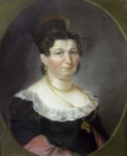 | Brustbild einer Dame in schwarzem mit Spitze besetztem Kleid und hochgesteckter Frisur, en face dem Betrachter zugewandt | |