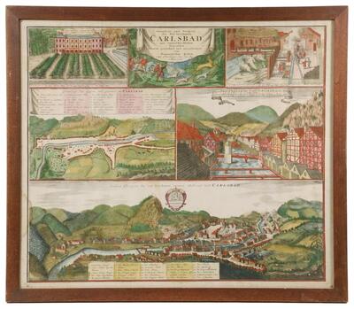 "Grundriss und Prospect des Welt-beruhmten Carlsbad, mit unterschiedlichen Gegenden accurat gezeichnet und ausgefertiget von Homannischen Erben. Cum Privilegio Sac. Caes. Maj. Anno 1733." Homann, N�rnberg, 1733. Impression: 495 by 580mm (19� by 22? i | |
