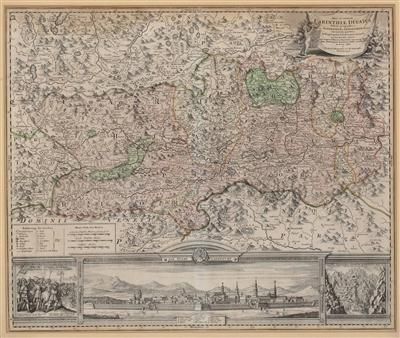| Landkarte von Kärnten mit Ansicht von Klagenfurt, Fürstensteinzeremonie und Loibl-Paß, bezeichnet: "Nova et accurata Carinthiae | |