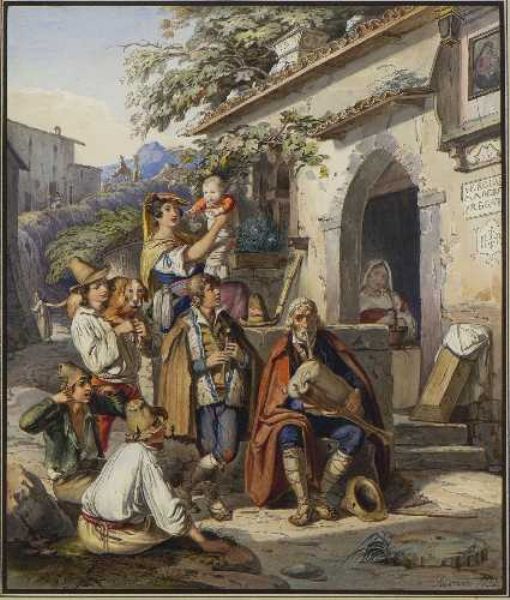 Pifferari vor dem Bauernhaus