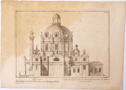 Grundriss, Durchschnitt und Fassadenansicht der Kirche St. Caroli Boromaei
