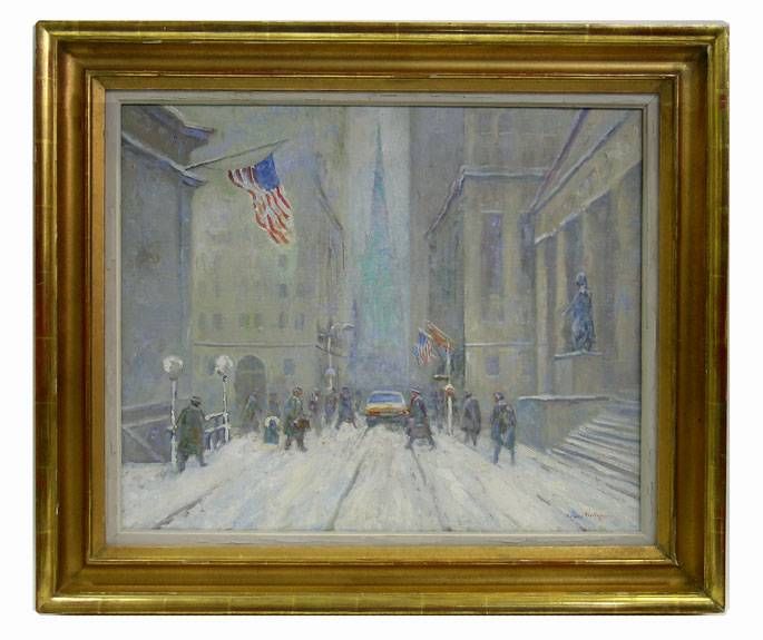 Winter view down Wall Street to Trinity Church, NYC