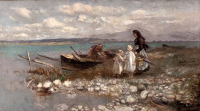 | Fischer und Bäuerin in Tracht mit Kindern am Chiemseeufer | |