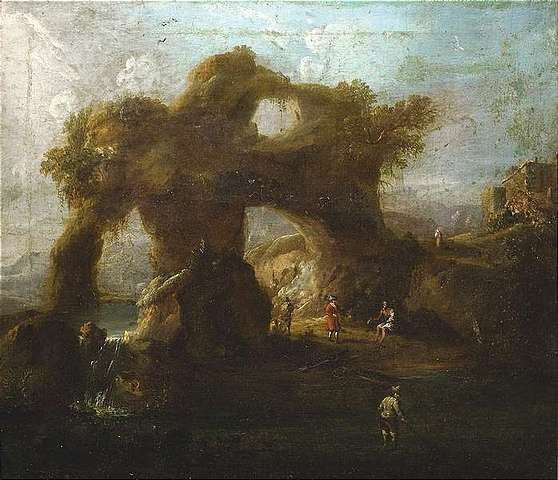 | Italienische Landschaft mit bizarrem Felsentor und Figurenstaffage | |