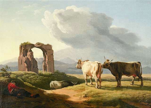 | An extensive landscape with cows and a shepherd, a classical ruin beyond | |