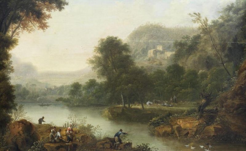 | An extensive river landscape with figures resting on the banks and others fishing | |