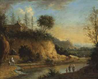 | A river landscape with travellers on a path, a hilltop house above | |
