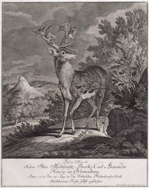 | Diesen Hirsch haben ... Carl Alexander Herzog zu Würtenberg Anno 1735 ... geschoßen | |