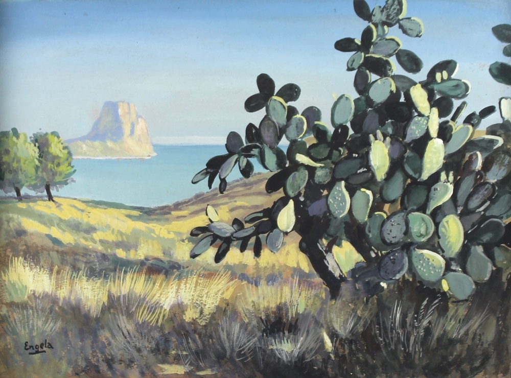 | a 20th century landscape study of a coastline with prickly pear plant in the foreground | |