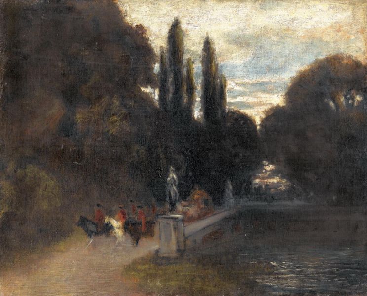 Fürstlicher Park mit Teichanlage und Kutsche.