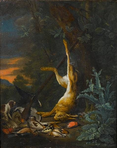 | A dead hare and finches with a spaniel and hunting paraphernalia beneath a tree | |