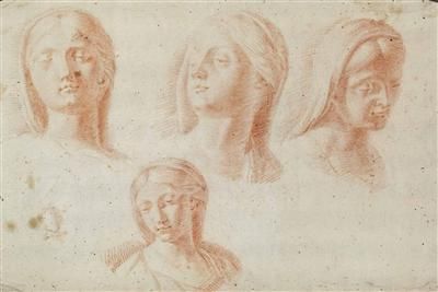 Vier Varianten eines Frauenkopfes rückseitig "Pferdestudien" und"Kavaliere"