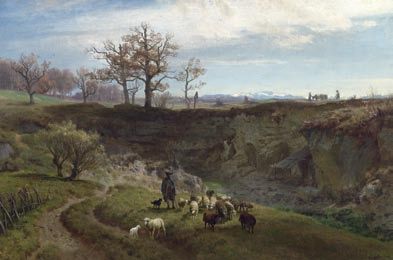 | Landschaft mit Schafen und Hirten und Weitblick in die Berge | |