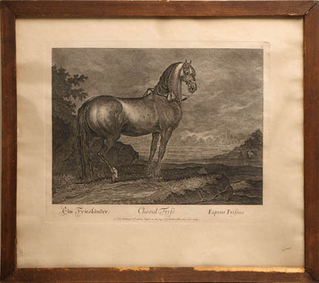 Darstellung eines Friesländer Pferdes vor weiter Landschaft mit kleinem Dorf