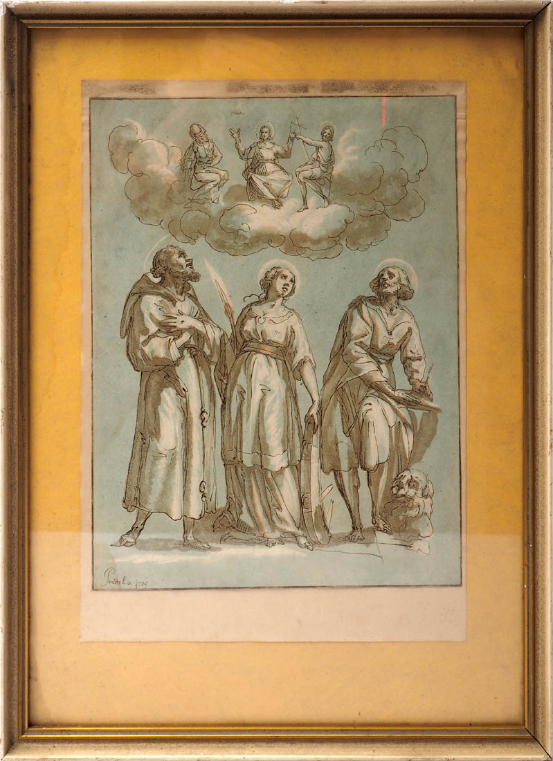 | Auf hellblauem Fond Darstellung der Heiligen Franz von Assisi, Katharina und Hieronymus | |