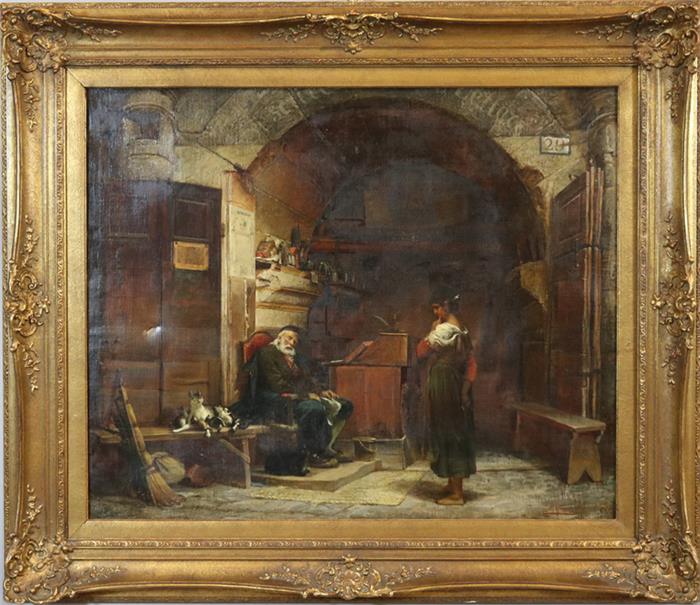 | Italienisches Gewölbe mit einem schlafenden, öffentlichen Schreiber und einer Katzenfamilie, von Mädchen beobachtet | |