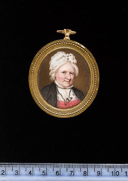 | Elisabeth Carter, wearing pink dress with white fill-in, black lace-edged shawl, black ribbon necklace and white bonnet adorned | |