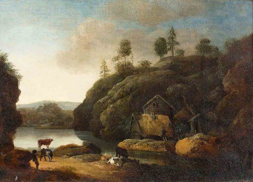 | 1. Seeuferpartie mit weidendem Vieh und Haus. 2. Flussuferpartie mit weidendem Vieh am Fuss eines Hügels | |