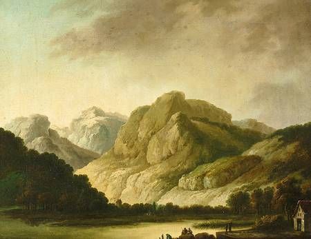 Seenlandschaft mit Figurenstaffage und aufragendem Gebirgsmassiv