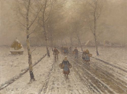 Bauern auf breiter Allee in verschneiter Landschaft