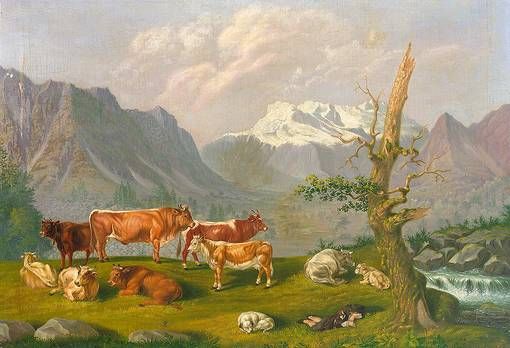 | Weidelandschaft in den Schweizer Bergen mit Katarakt und Gebirgshorizont. Im Vordergrund schlafender Hirte und Kuhherde. Prachtv | |