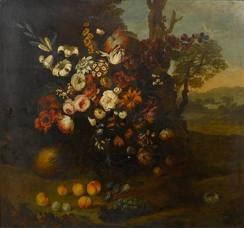 | Roses, peonies, tulips and white lilies in a glass vase with peaches, grapes, plums, a melon, a pumpkin and a bird's nest in a l | |