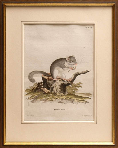 | Ausschnitt aus einer Waldlandschaft. Auf einem Baumstumpf sitzt ein Siebenschläfer, ein Stück Birne in den Vorderpfoten haltend | |