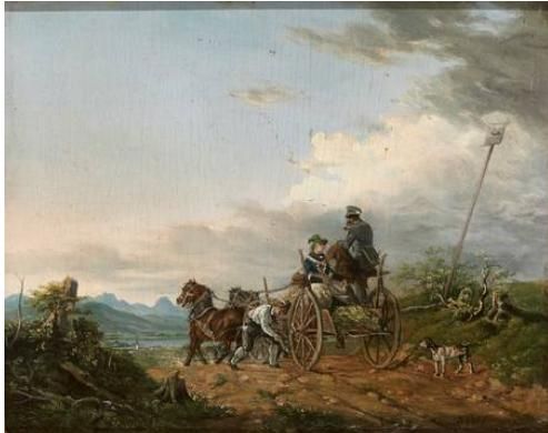| Zweispänniges Gefährt mit Personenstaffage auf altem Weg, im Hintergrund bayerischer Gebirgssee. | |