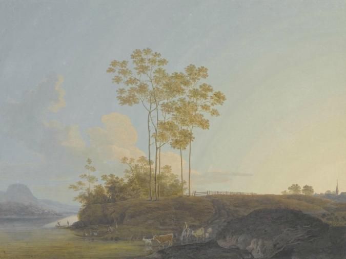 | Pair of works: 1. Morning scene: Swiss lake landscape with herdsman and herd of cows in foreground. 2.Evening scene: Swiss lands | |