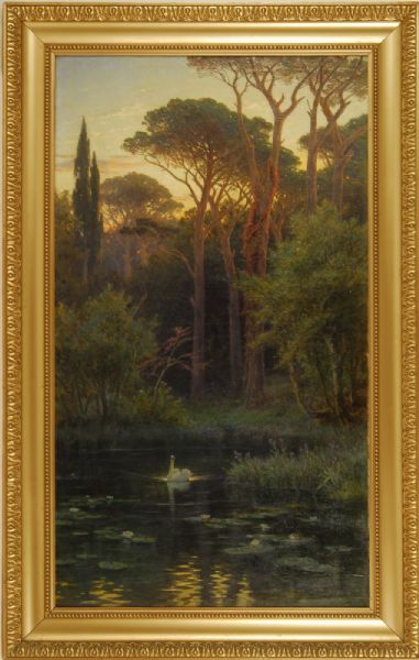Luminous landscape with a swan and a lily pond.