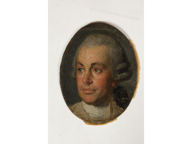 | An oval head study of a gentleman with curls and a ribbon in his hair | |