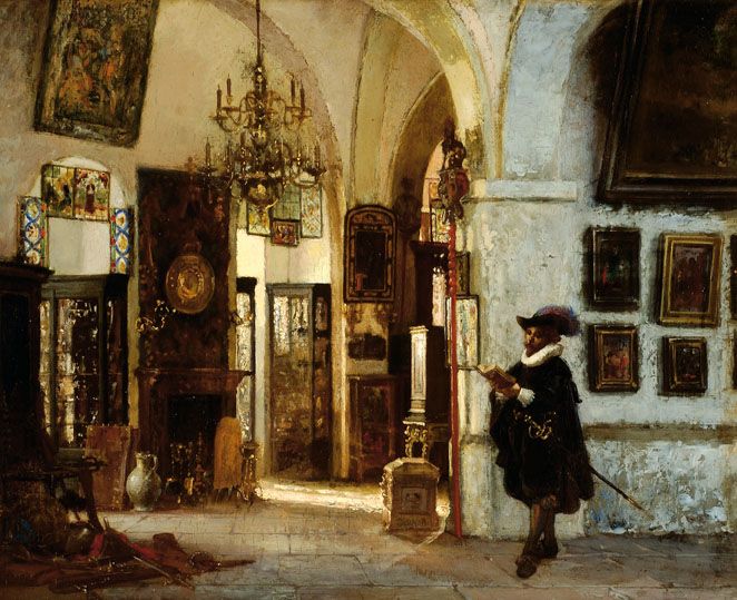 | Man in seventeenth-century costume with a book in an interior | |