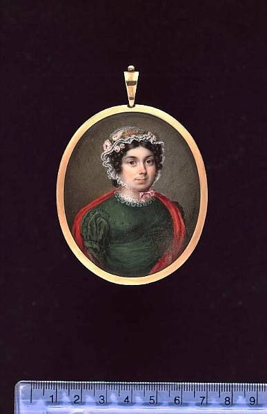 | A Lady of the Harrington or Wright family, wearing green dress with white gauze collar, red shawl over her shoulders and white l | |