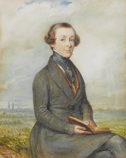 | A young Gentleman, seated in a landscape, wearing grey frock coat, tan waistcoat | |