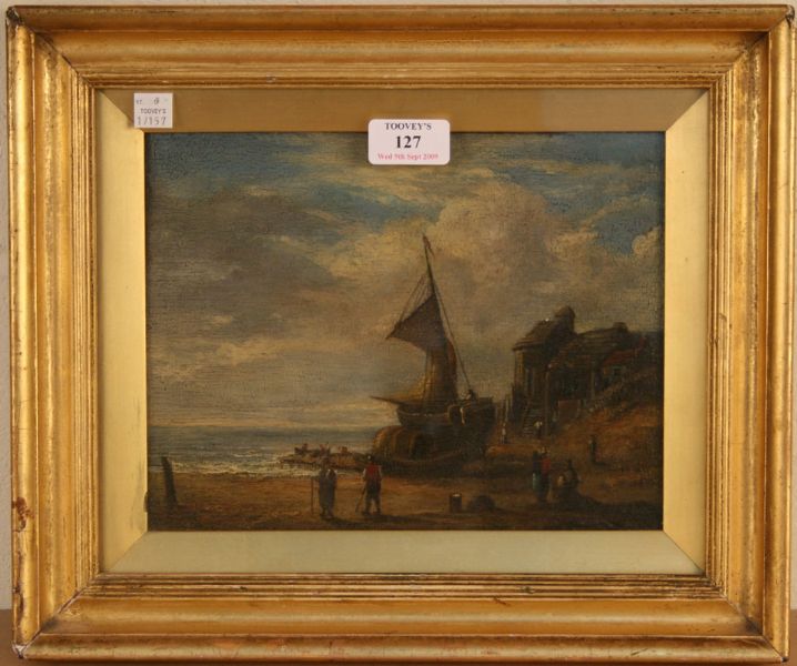 Dutch Coastal View with Figures near Beached Boats and Cottages