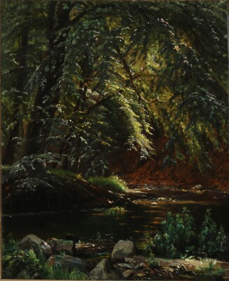 Sunlight through the treetops over a creek