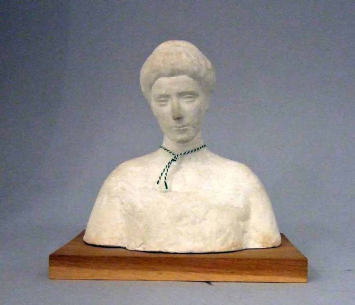 Byst av kvinnofigur på träsockel, daterad till 1906.