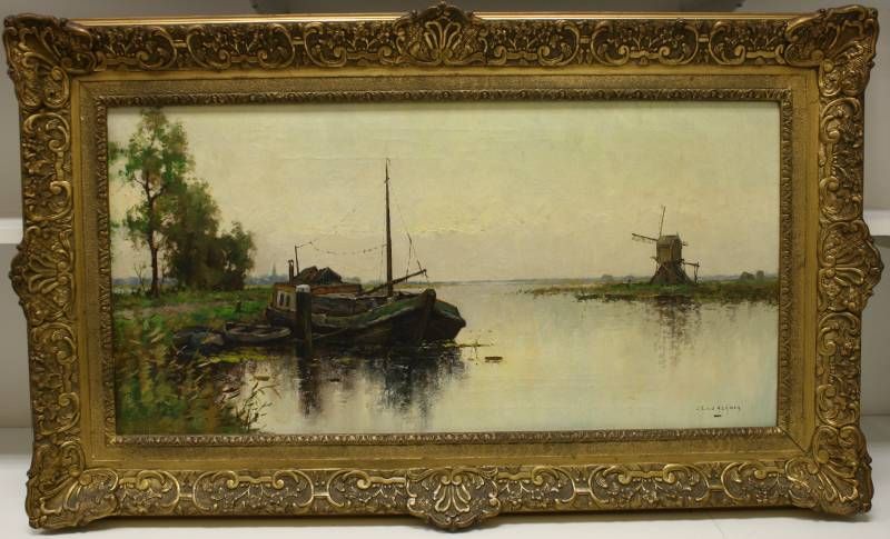 Molen en boot op de Nieuwkoopse Plas (de kunstenaar had hier een woonboot)
