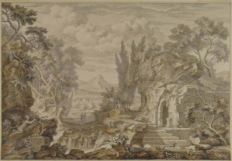 | Figures in an arcadian landscape with a ruin in the foreground | |