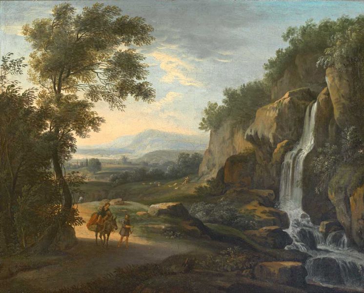 Arkadische Landschaft mit Katarakt und Figurenstaffage