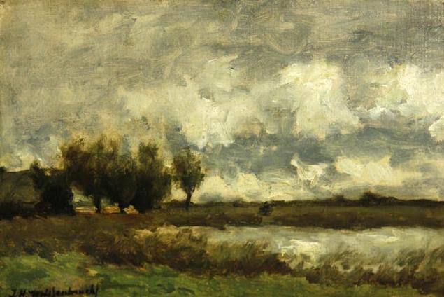 A polder landscape under cloudy skies