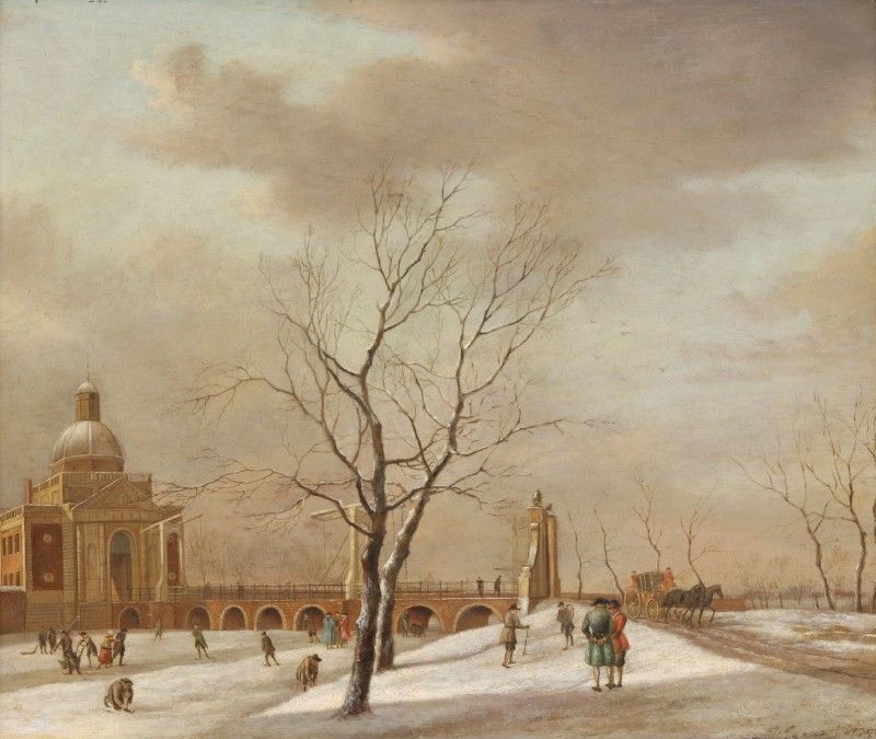 | A view of the Muiderpoort, Amsterdam, in winter, with skaters on the frozen Singelgracht an a horse-drawn carriage on the road | |