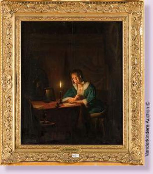 Jeune fille écrivant une lettre à la lueur de la bougie.