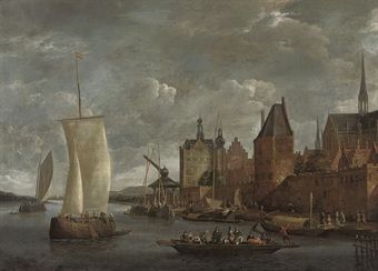 | A river landscape with travellers on a ferry boat and other shipping by a quayside | |